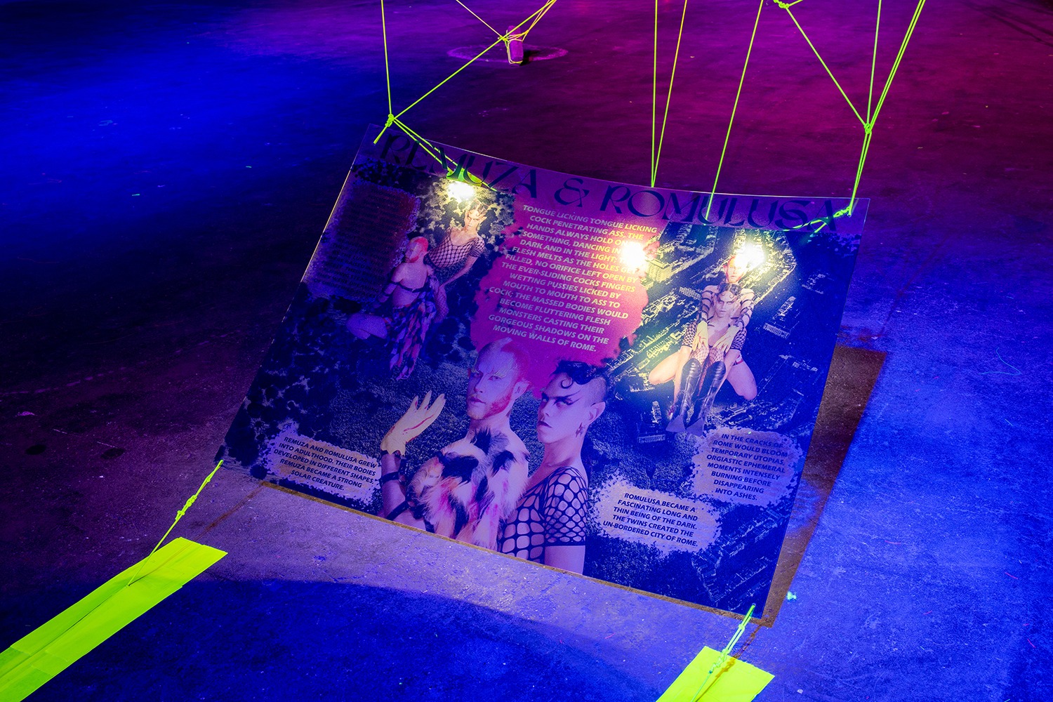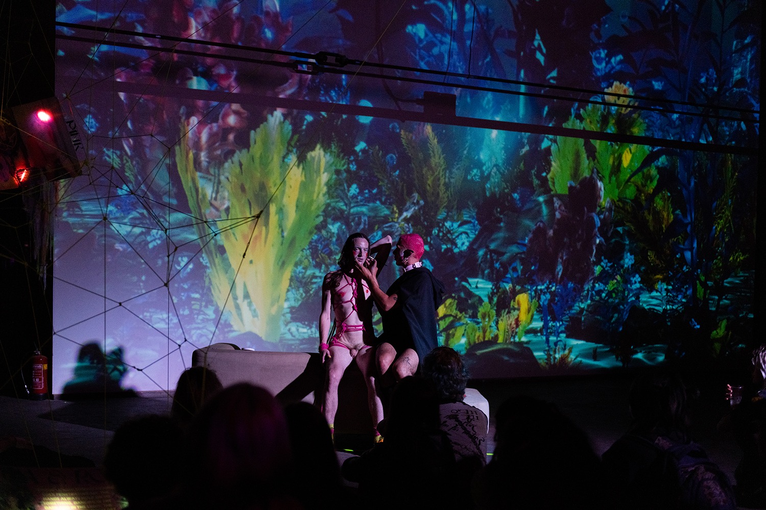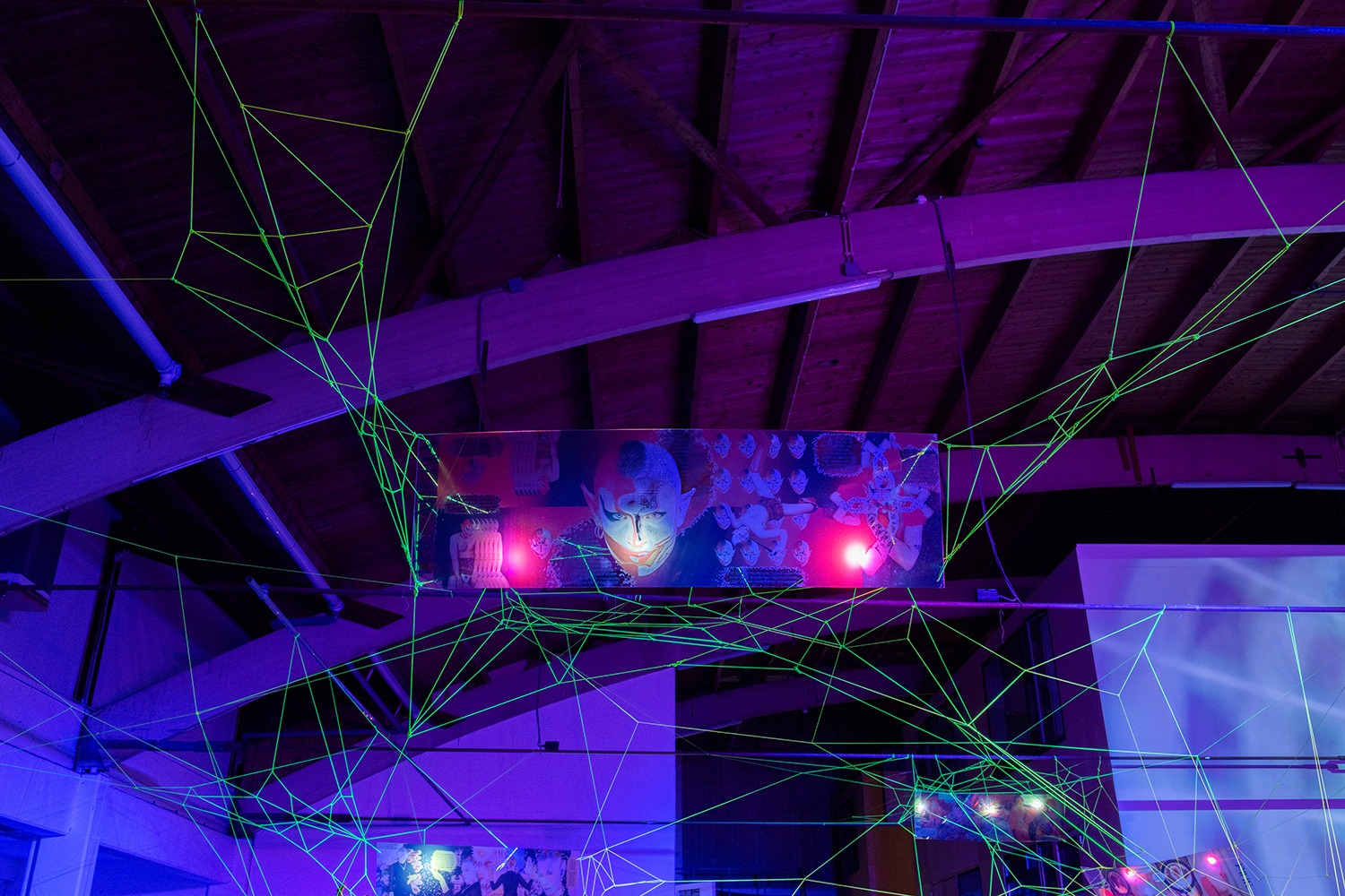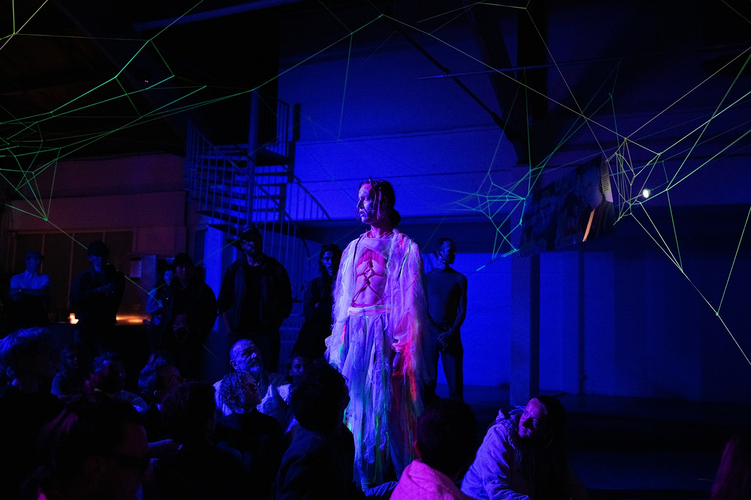 “PASTLIVES is a saga-performance presented within the cosmology of SasaHara’s mythology. In this new work, the artist explored how the independent stories collide when they are being assembled into a meta-narrative: the threshold between a collection of myths and a mythology. The performance takes place in-and-around a cosmic web designed by the shibari artist Ramzart, within which five of SasaHara’s stories are integrated, and presented in the format of comic-strips designed by Sondi (stories Down in the Abyss, Inferno, The Arena, Remuza&Romulusa, and PINK). The comics are composed of drag characters conceived by the artist (visuals by Luca Barbieri, 3D by Sondi), and fragments of their texts. A sixth story was created for this exhibition, SYLVANOMACHY, which exists in a video format showcasing SasaHara’s drag character as a narrator; set-design and costume by Rozy Sapelkine, video direction, filming and editing by jujulov3, and sound recording by Philip Ullman. SYLVANOMACHY is presented in a magical forest shrine built by Basse Stittgen, enhanced by the scenography of the video-work. PASTLIVES is a 45 minutes storytelling narration of the stories SYLVANOMACHY, Down in the Abyss, and PINK in an immersive multimedia theater-work. A part of the scenography consists of video-works designed by Guillaume Roux. PASTLIVES is presented during the opening night, after which an exhibition of its persisting scenography remains, recalling traces of the performance. Much like the forces of physics that pull stars into planetary structures, PASTLIVES is made up of many: an arrangement of disciplines, memories, and stories are the forces which mold these parts into a meta-mythology that speaks of identity, body politics and gender fluidity.”