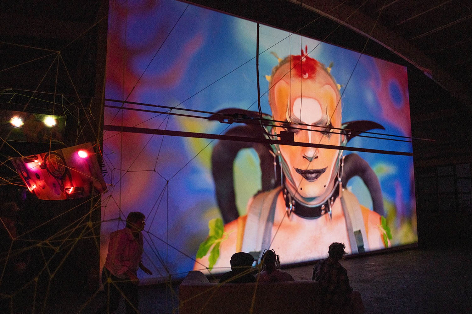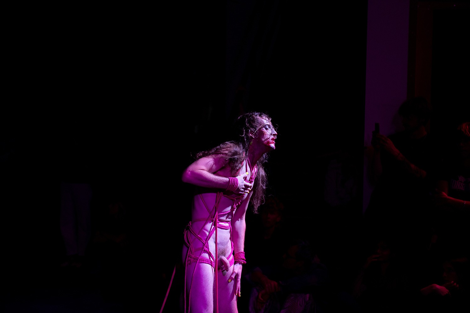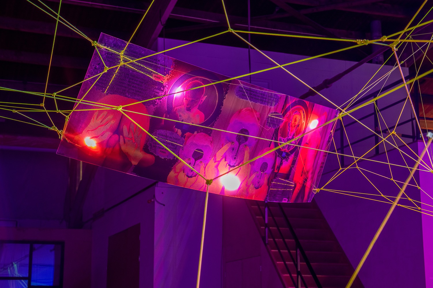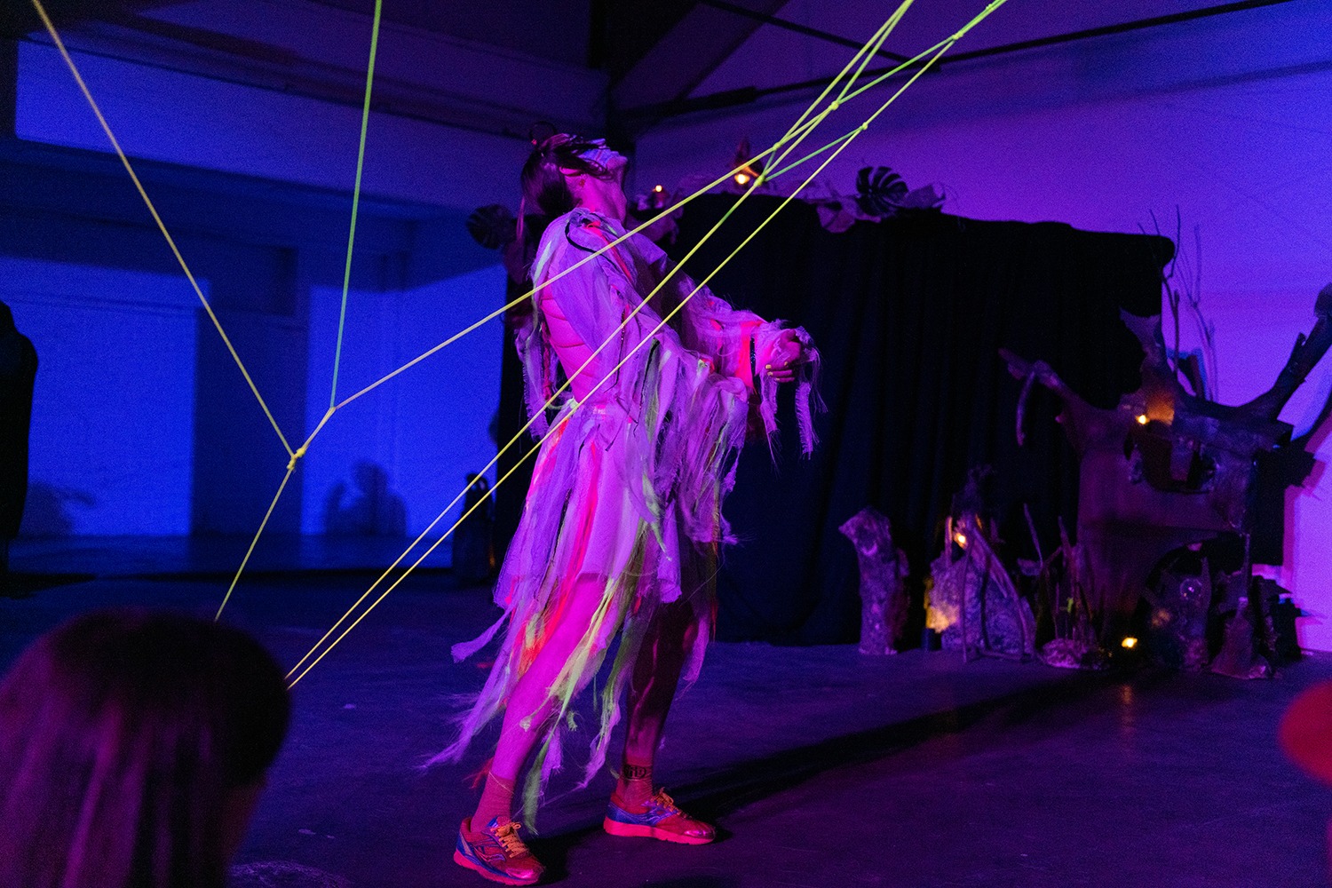 “PASTLIVES is a saga-performance presented within the cosmology of SasaHara’s mythology. In this new work, the artist explored how the independent stories collide when they are being assembled into a meta-narrative: the threshold between a collection of myths and a mythology. The performance takes place in-and-around a cosmic web designed by the shibari artist Ramzart, within which five of SasaHara’s stories are integrated, and presented in the format of comic-strips designed by Sondi (stories Down in the Abyss, Inferno, The Arena, Remuza&Romulusa, and PINK). The comics are composed of drag characters conceived by the artist (visuals by Luca Barbieri, 3D by Sondi), and fragments of their texts. A sixth story was created for this exhibition, SYLVANOMACHY, which exists in a video format showcasing SasaHara’s drag character as a narrator; set-design and costume by Rozy Sapelkine, video direction, filming and editing by jujulov3, and sound recording by Philip Ullman. SYLVANOMACHY is presented in a magical forest shrine built by Basse Stittgen, enhanced by the scenography of the video-work. PASTLIVES is a 45 minutes storytelling narration of the stories SYLVANOMACHY, Down in the Abyss, and PINK in an immersive multimedia theater-work. A part of the scenography consists of video-works designed by Guillaume Roux. PASTLIVES is presented during the opening night, after which an exhibition of its persisting scenography remains, recalling traces of the performance. Much like the forces of physics that pull stars into planetary structures, PASTLIVES is made up of many: an arrangement of disciplines, memories, and stories are the forces which mold these parts into a meta-mythology that speaks of identity, body politics and gender fluidity.”