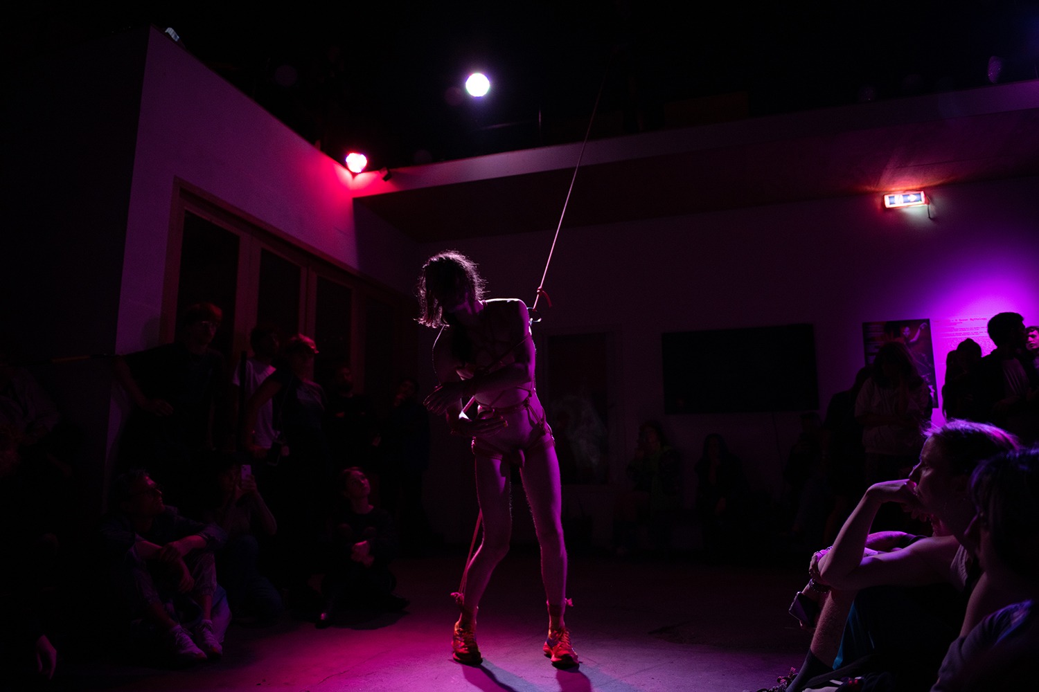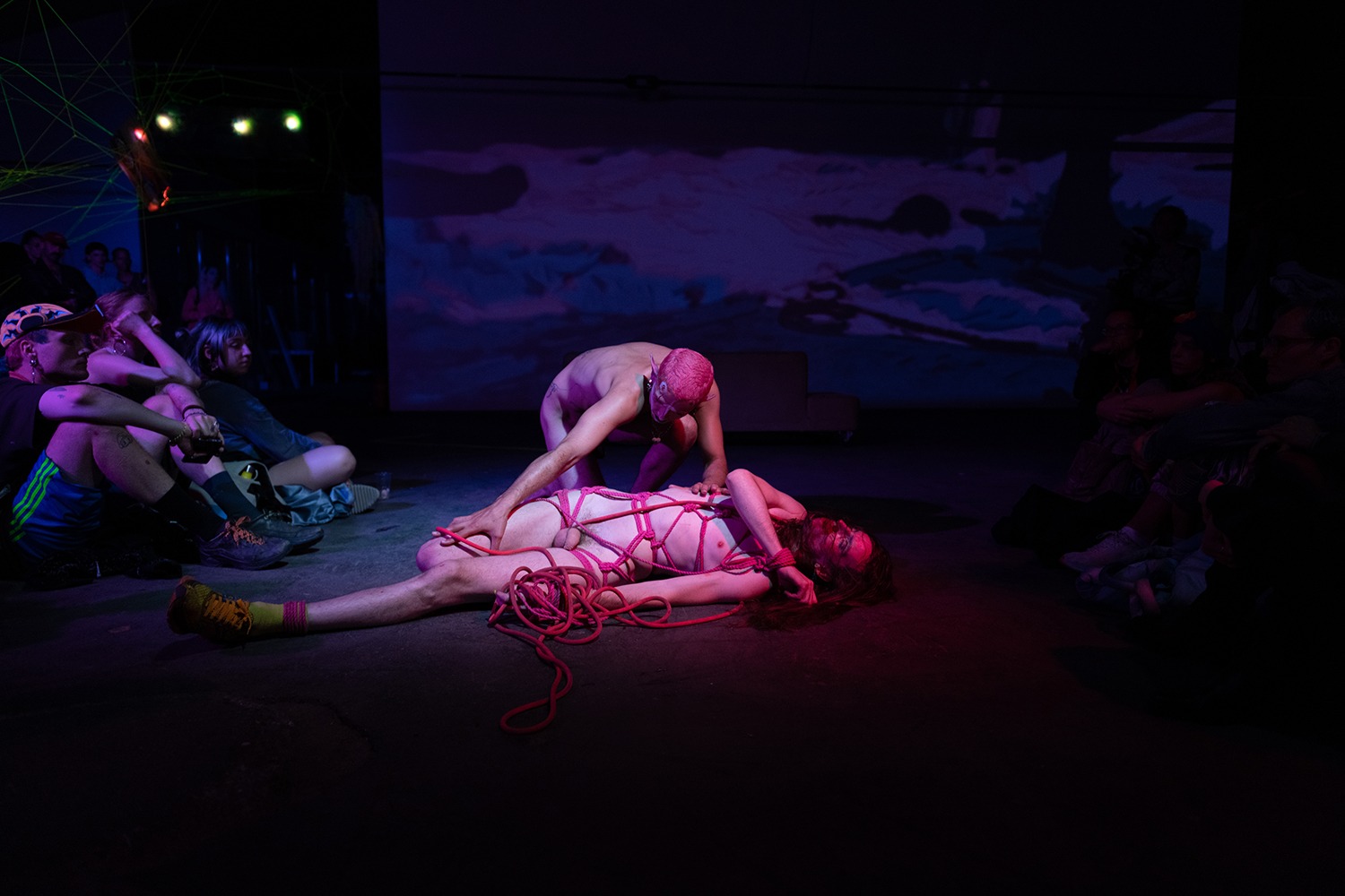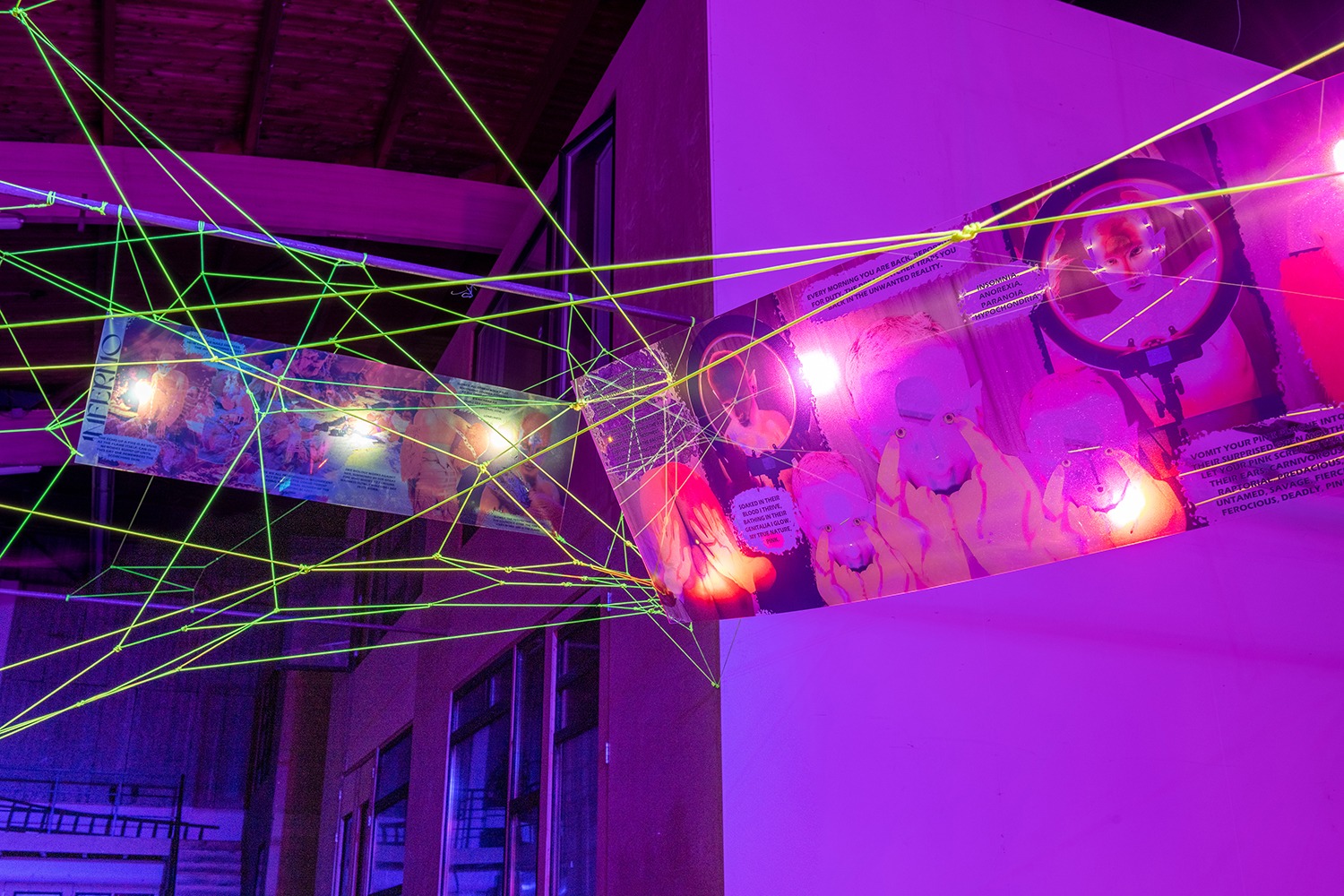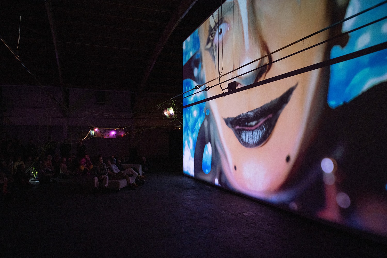 “PASTLIVES is a saga-performance presented within the cosmology of SasaHara’s mythology. In this new work, the artist explored how the independent stories collide when they are being assembled into a meta-narrative: the threshold between a collection of myths and a mythology. The performance takes place in-and-around a cosmic web designed by the shibari artist Ramzart, within which five of SasaHara’s stories are integrated, and presented in the format of comic-strips designed by Sondi (stories Down in the Abyss, Inferno, The Arena, Remuza&Romulusa, and PINK). The comics are composed of drag characters conceived by the artist (visuals by Luca Barbieri, 3D by Sondi), and fragments of their texts. A sixth story was created for this exhibition, SYLVANOMACHY, which exists in a video format showcasing SasaHara’s drag character as a narrator; set-design and costume by Rozy Sapelkine, video direction, filming and editing by jujulov3, and sound recording by Philip Ullman. SYLVANOMACHY is presented in a magical forest shrine built by Basse Stittgen, enhanced by the scenography of the video-work. PASTLIVES is a 45 minutes storytelling narration of the stories SYLVANOMACHY, Down in the Abyss, and PINK in an immersive multimedia theater-work. A part of the scenography consists of video-works designed by Guillaume Roux. PASTLIVES is presented during the opening night, after which an exhibition of its persisting scenography remains, recalling traces of the performance. Much like the forces of physics that pull stars into planetary structures, PASTLIVES is made up of many: an arrangement of disciplines, memories, and stories are the forces which mold these parts into a meta-mythology that speaks of identity, body politics and gender fluidity.”