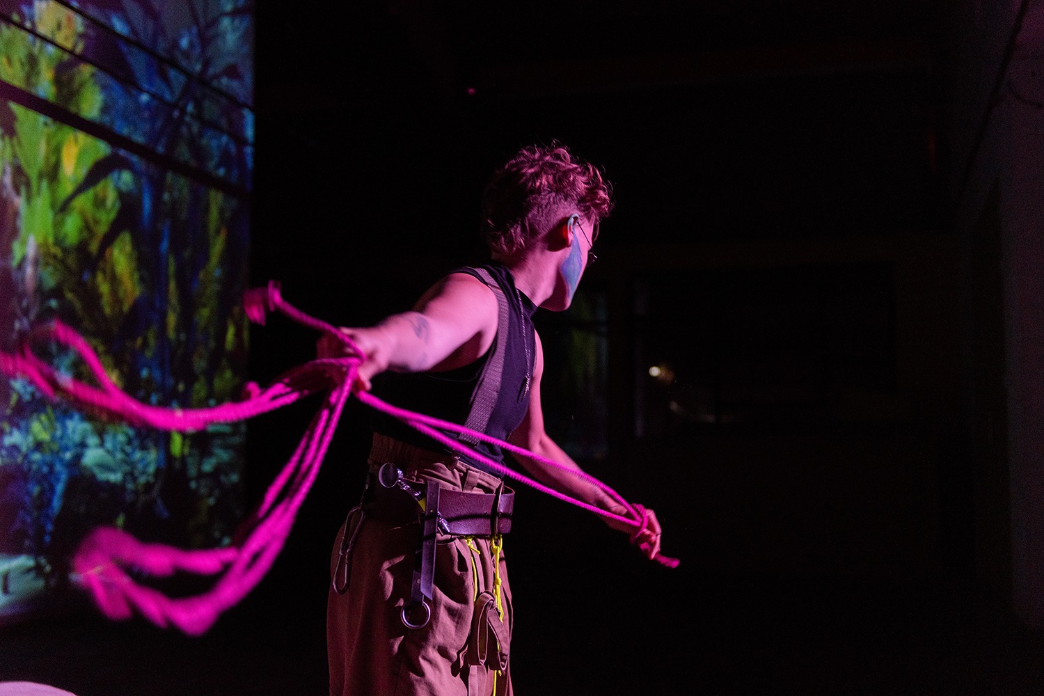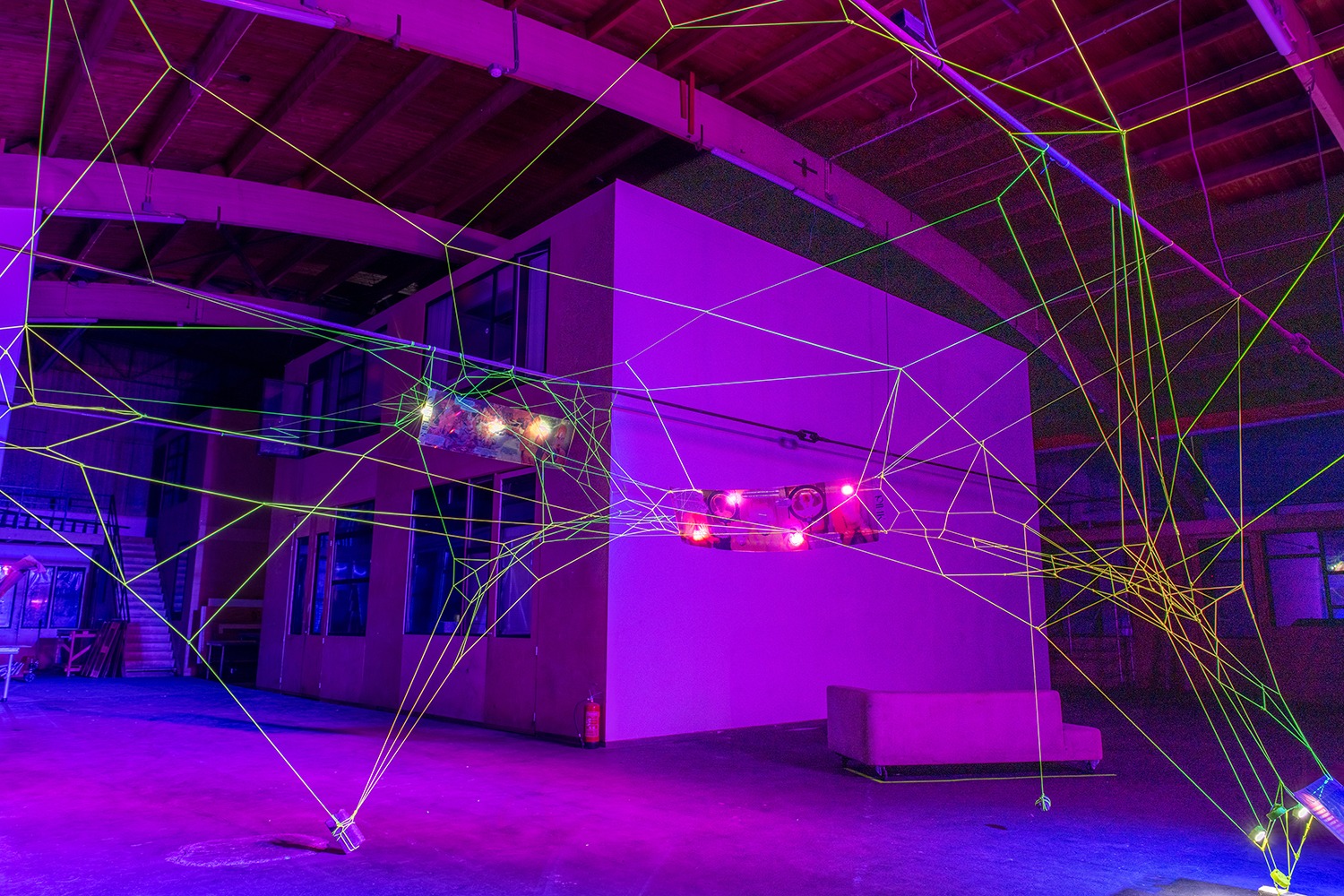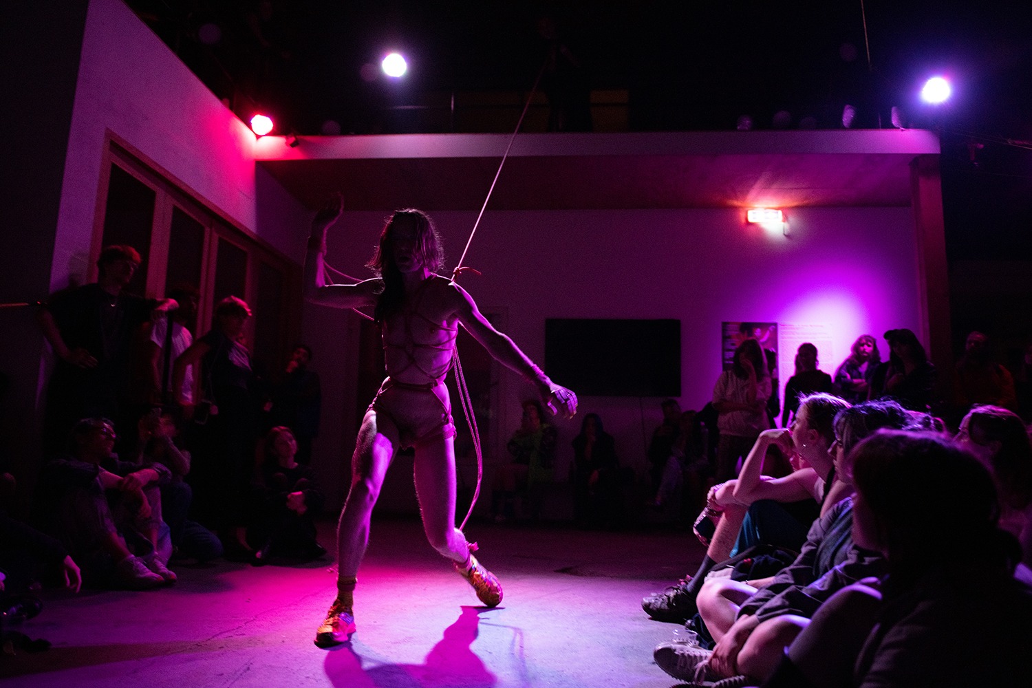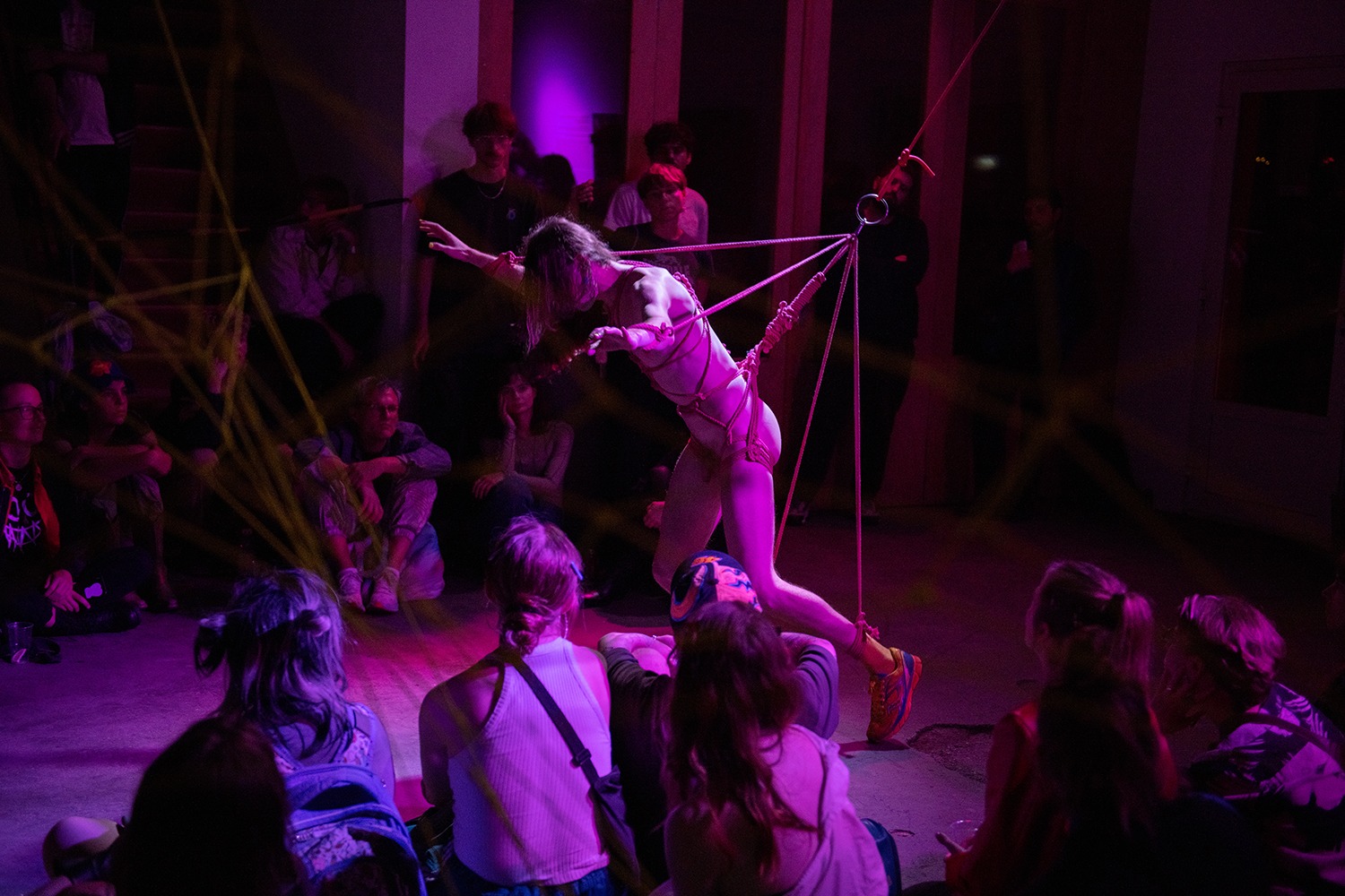 “PASTLIVES is a saga-performance presented within the cosmology of SasaHara’s mythology. In this new work, the artist explored how the independent stories collide when they are being assembled into a meta-narrative: the threshold between a collection of myths and a mythology. The performance takes place in-and-around a cosmic web designed by the shibari artist Ramzart, within which five of SasaHara’s stories are integrated, and presented in the format of comic-strips designed by Sondi (stories Down in the Abyss, Inferno, The Arena, Remuza&Romulusa, and PINK). The comics are composed of drag characters conceived by the artist (visuals by Luca Barbieri, 3D by Sondi), and fragments of their texts. A sixth story was created for this exhibition, SYLVANOMACHY, which exists in a video format showcasing SasaHara’s drag character as a narrator; set-design and costume by Rozy Sapelkine, video direction, filming and editing by jujulov3, and sound recording by Philip Ullman. SYLVANOMACHY is presented in a magical forest shrine built by Basse Stittgen, enhanced by the scenography of the video-work. PASTLIVES is a 45 minutes storytelling narration of the stories SYLVANOMACHY, Down in the Abyss, and PINK in an immersive multimedia theater-work. A part of the scenography consists of video-works designed by Guillaume Roux. PASTLIVES is presented during the opening night, after which an exhibition of its persisting scenography remains, recalling traces of the performance. Much like the forces of physics that pull stars into planetary structures, PASTLIVES is made up of many: an arrangement of disciplines, memories, and stories are the forces which mold these parts into a meta-mythology that speaks of identity, body politics and gender fluidity.”