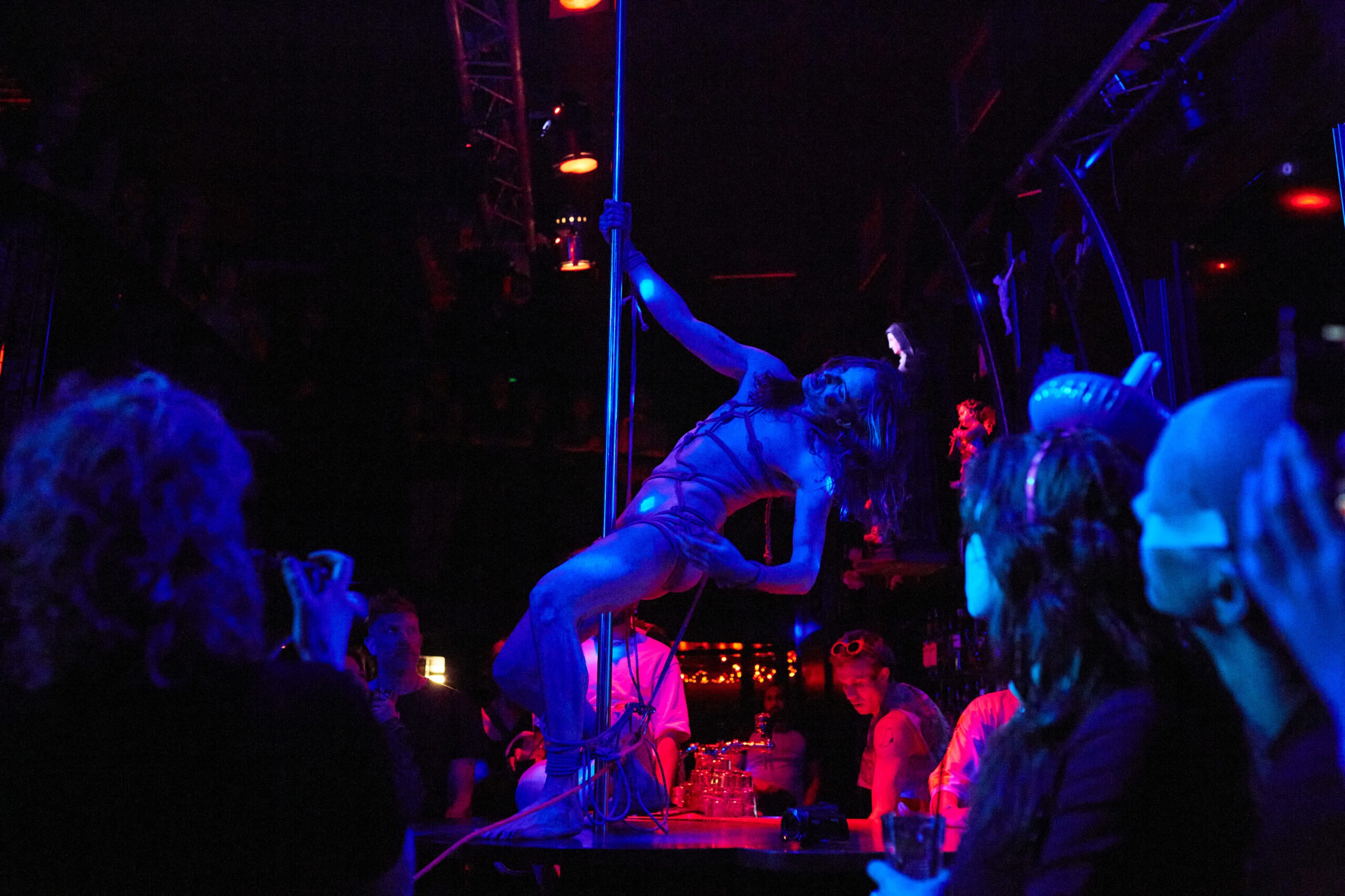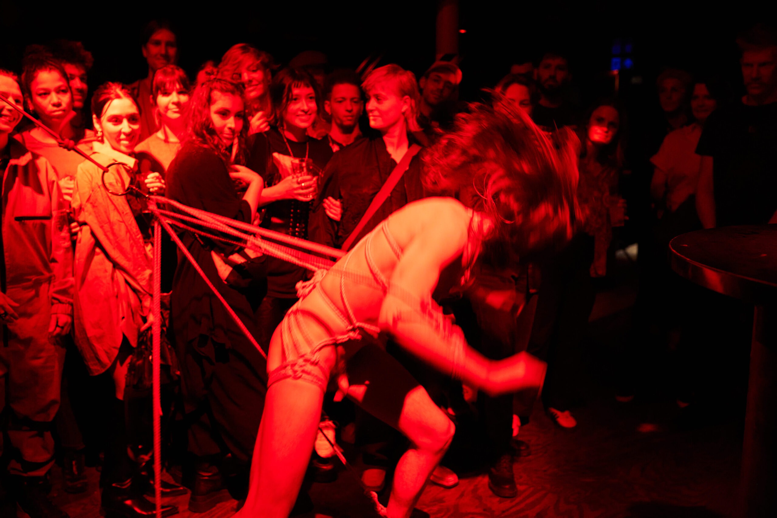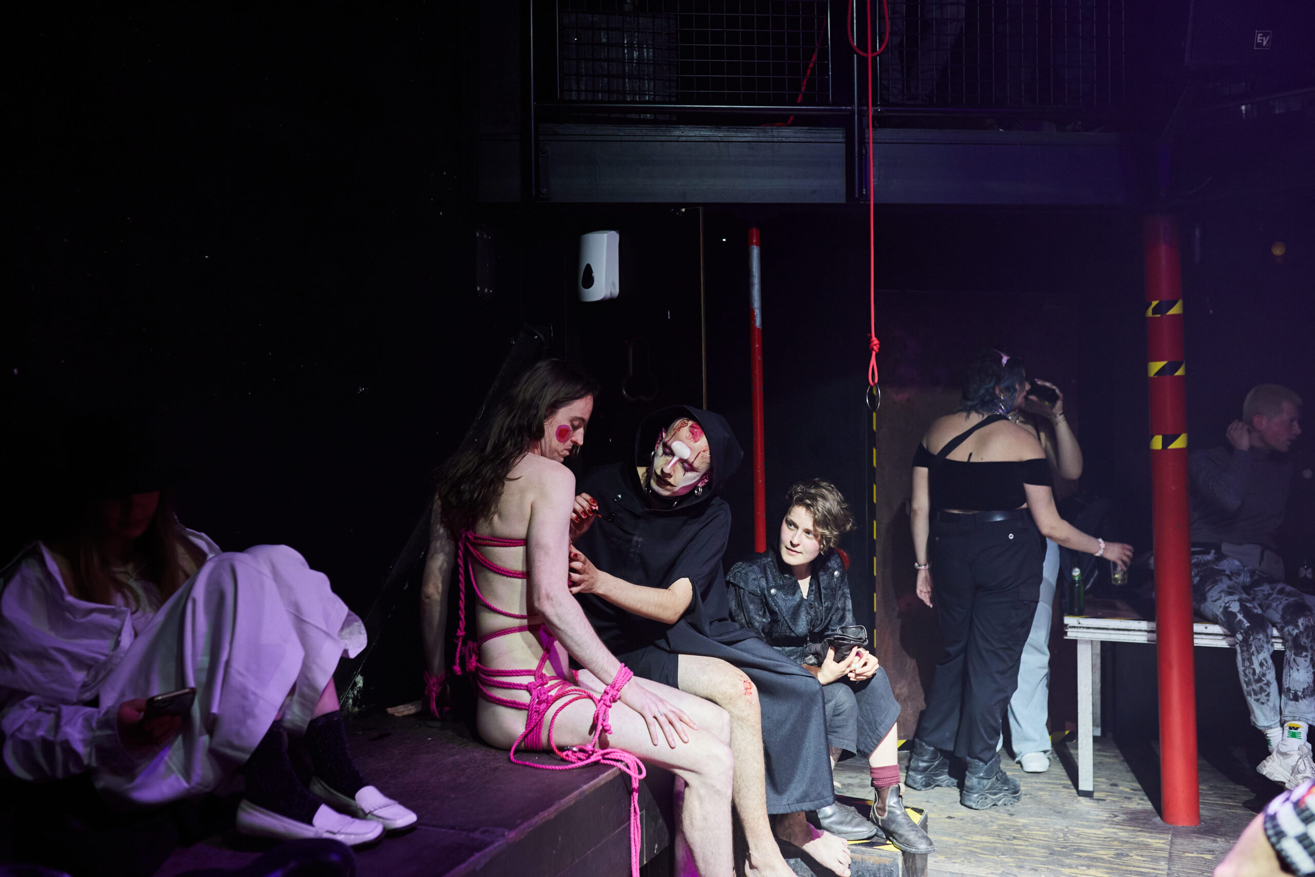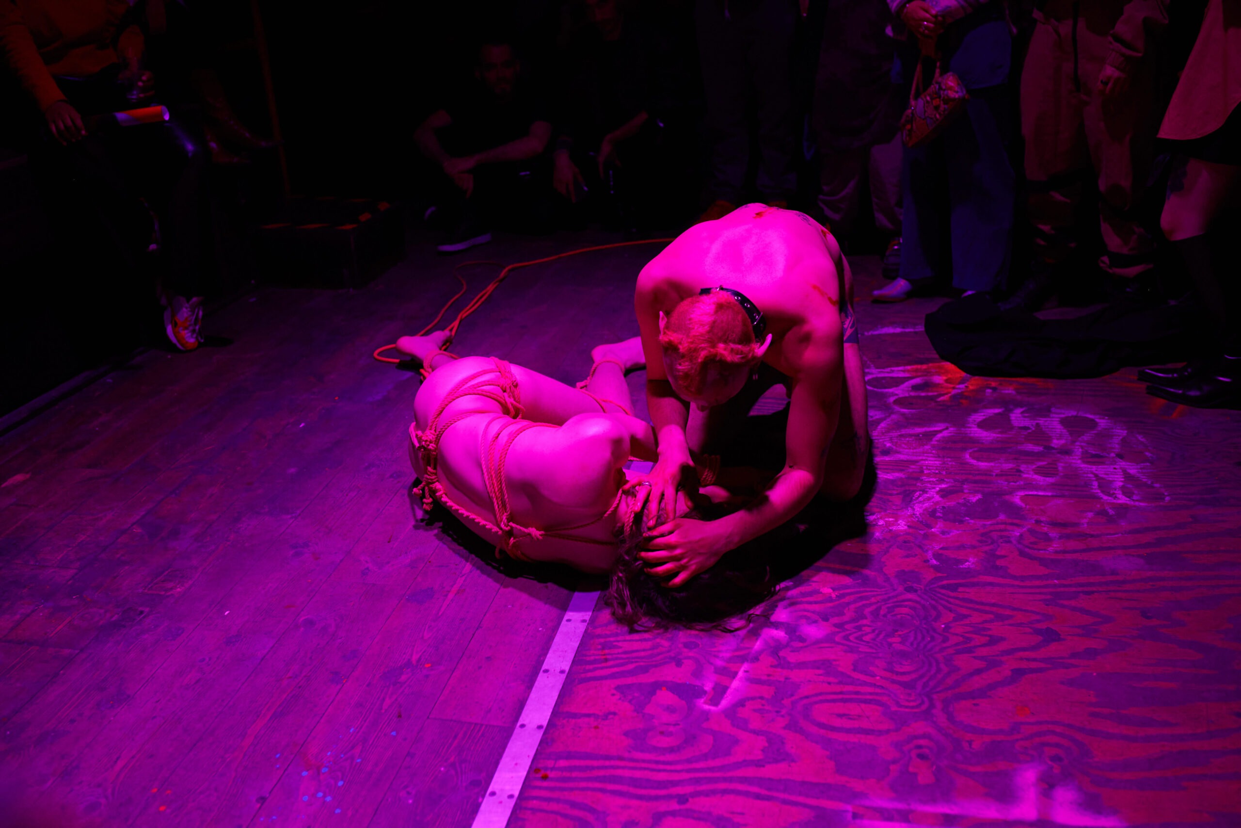 Eventually, the oral storytelling research was extended to the story PINK with the design of a soundscape in collaboration with Momo Conzen which was used to design the performance QUEERAGE. The work is an embodied performative storytelling of PINK. It tackles different layers of control experienced by queer bodies, a macro on the side of society, and a micro within our community or perhaps our own mind. In was performed by Patrick Schmatzer and SasaHara, the shibari design and production by Ramzart, the costume by Arthur Guilleminot and the video documentation by Rowena Buur.