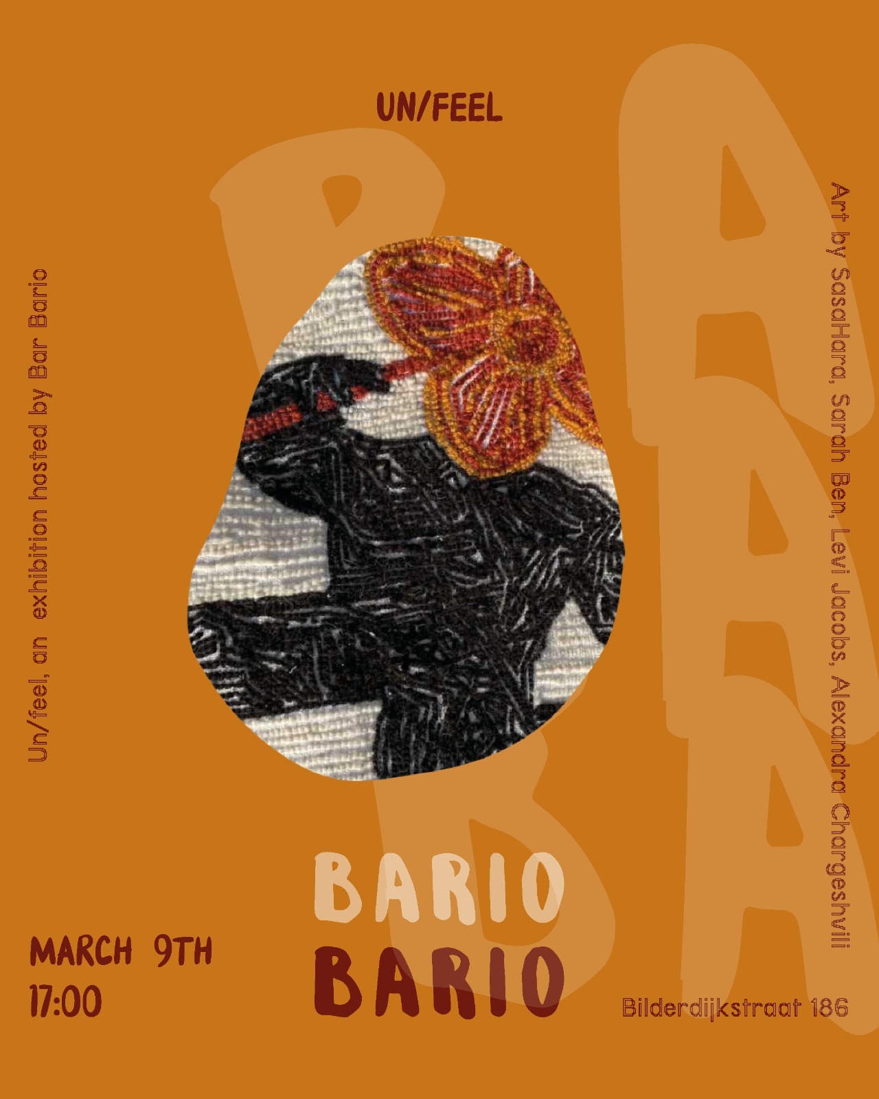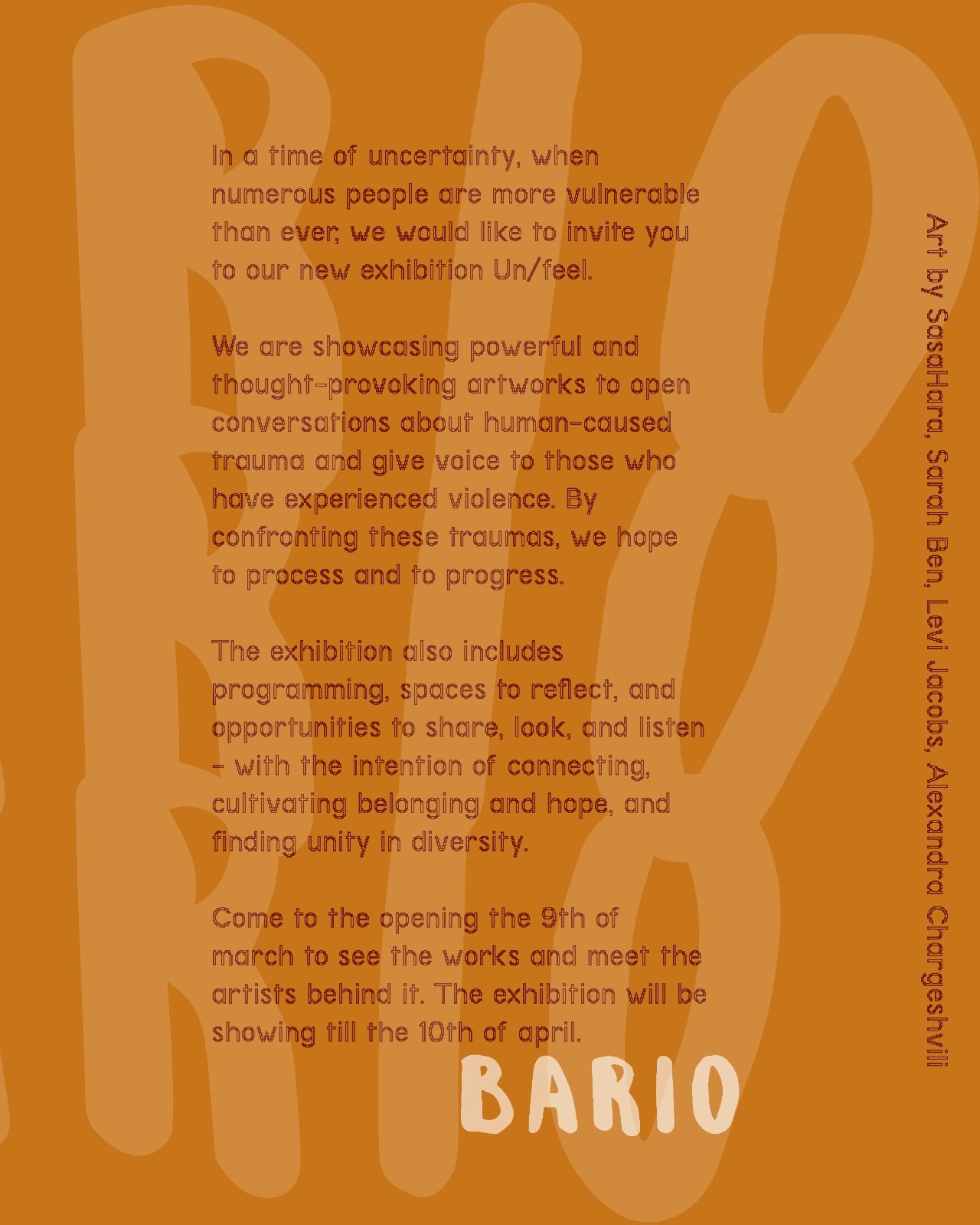 The exhibition UN/FEEL was proposed in March 2022 at Bario, Amsterdam. Bario is an inclusive space centred around a bar and a gallery space, with the objective of proposing an all-inclusive safe space for queers and BIPOCs. Through their gallery space they propose exhibitions and pop events focused around community-building. UN/FEEL gathered the works of Sarah Ben, Levi Jacobs, Alexandra Chargeshvili and the very first presentation of the SasaHara Past Lives. The show tackled trauma experiences and our ways to process them, and eventually progress.